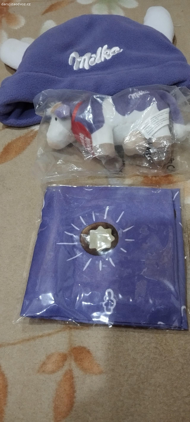 Za odvoz věci od Milky: čepičky, šátečky, kravička
