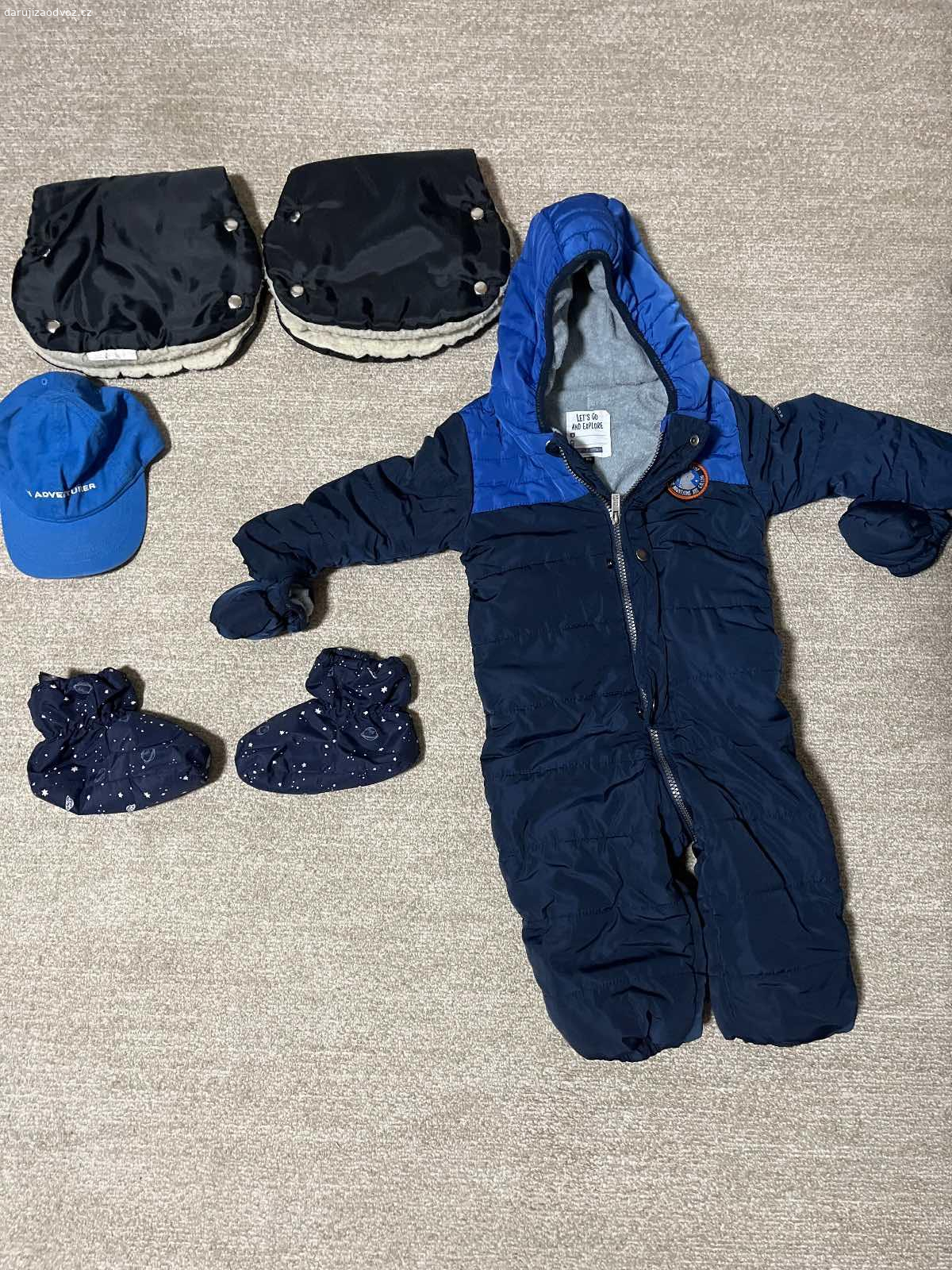 Daruji za odvoz zimní kombinézu vel. 86. Návleky na boty, kšiltovku a zimni rukávníky na kočárek.