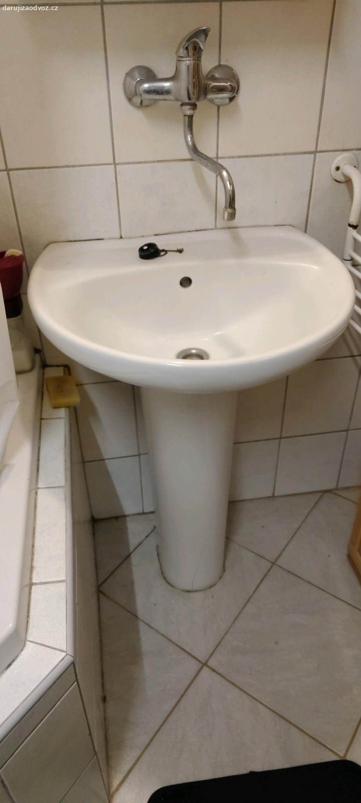 Daruji zachovalé umyvadlo i s nohou, stáří cca 20 let. Rozměry viz foto. Umyvadlo je v pohodě, noha má prasklinu. Je mi líto to vyhodit, možná to někdo ještě užije.
