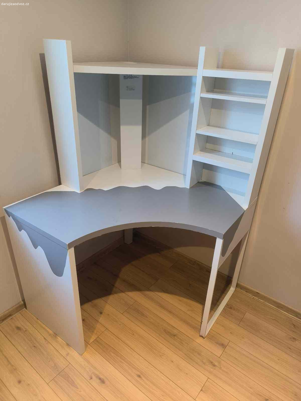 Stůl je bílo šedý s policí která je připevněna k pracovní desce stolu, stůl je rohový.