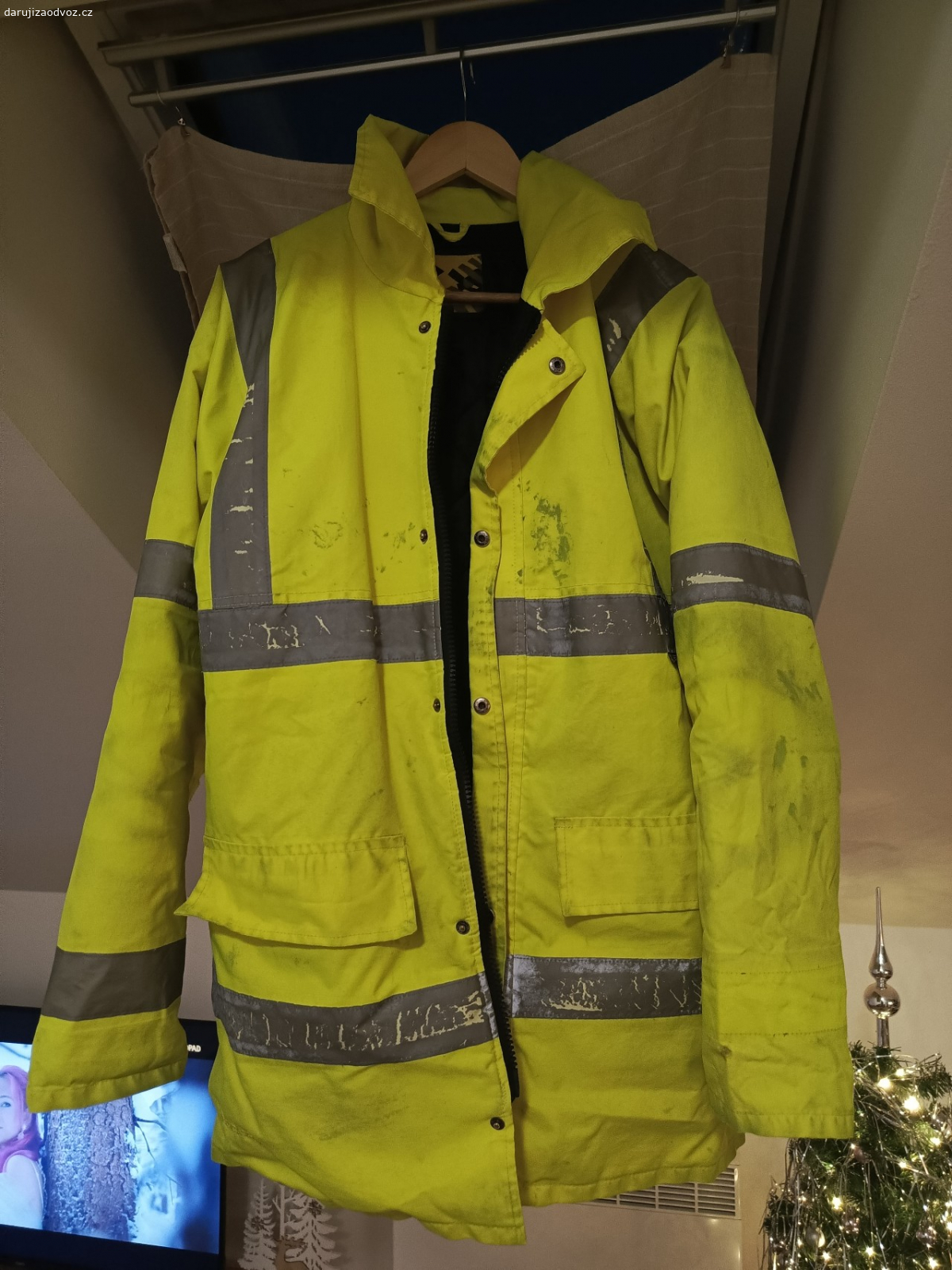 Reflexní bundu Dunlop velikost L.Řekla bych něco mezi L/XL.Nošená,jsou na ní fleky. Vypraná,fleky nejdou vyprat. Teď při focení jsem si všimla rozpáraného rukávu,viz foto. Tak vhodné pro někoho komu to nebude vadit a nebo někdo šikovný zašije a unosí dále.