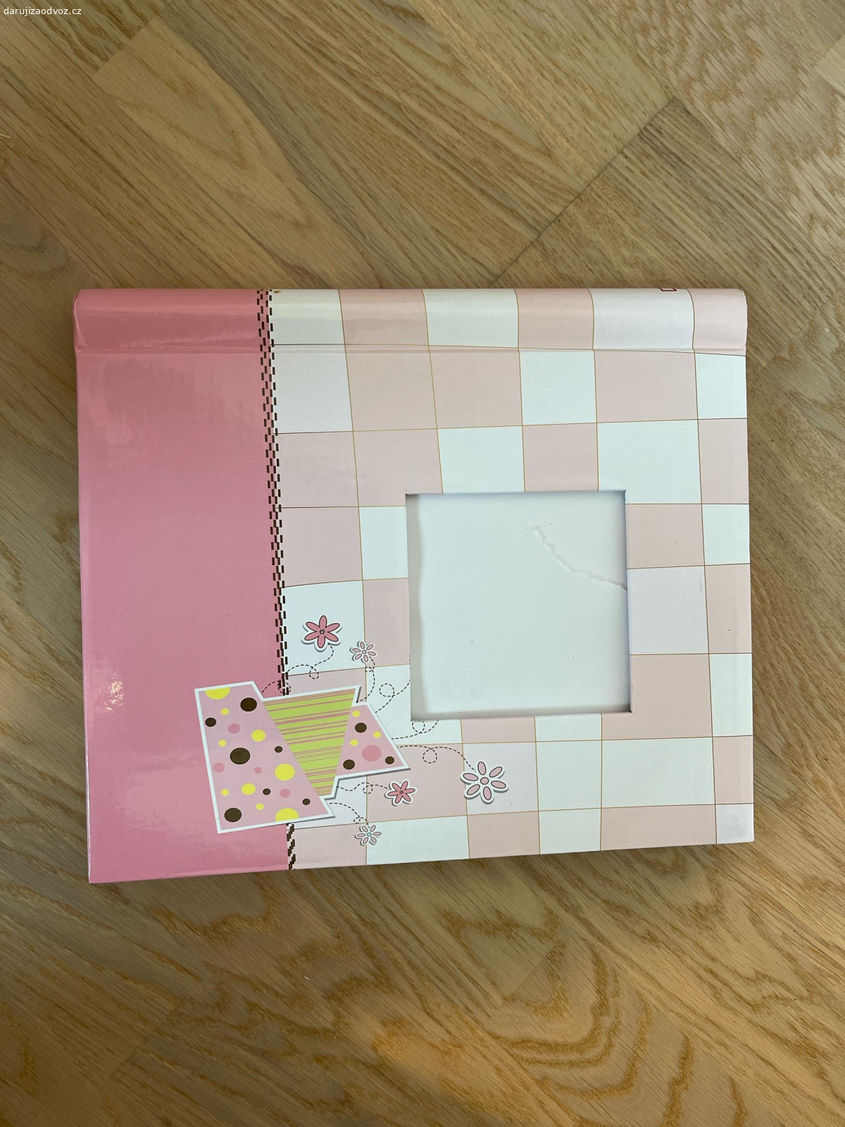 prázdné růžové fotoalbum. papír pro úvodní foto je potřeba přelepit