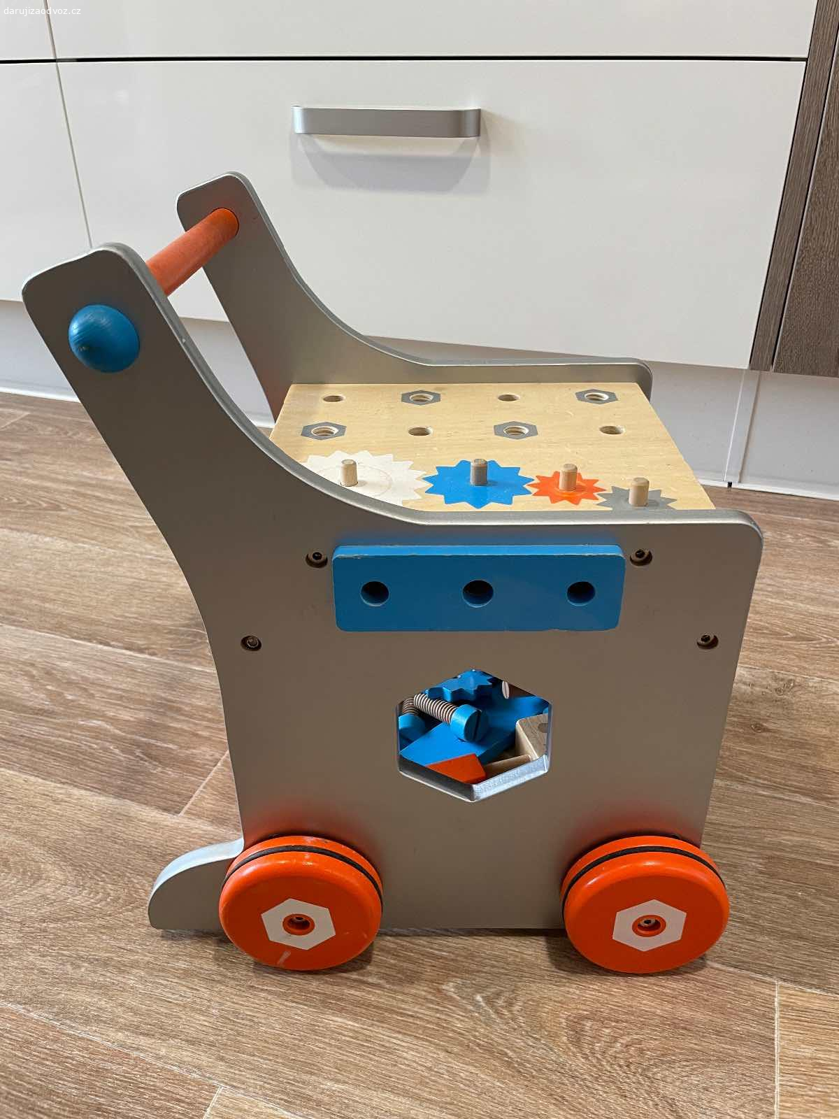Daruji za odvoz dřevěný ponk na kolečkách. Kolečka se dají sundat. K ponku jsou vruty, matice, hřebíky a kladivo (vše dřevěné) a další součástky (něco i kovového). Sada není kompletní a některé součástky jsou polámané nebo chybí (třeba svěrák). Ponk je obouchaný, také jsme ho podědili, ale stále se užije.