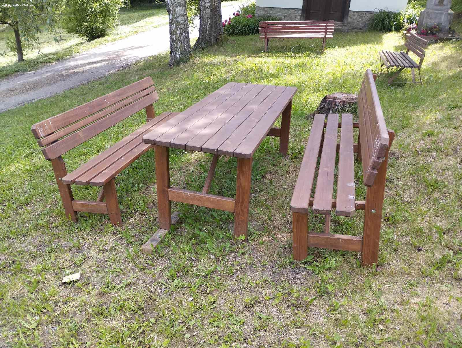 Daruji set zahradního nábytku ze dřeva. Solidní stav. Máme ho na naší vesnici, ale nikdo ho nevyužívá, tak jsme si řekli, že ho darujeme do dobrých rukou, než abychom ho likvidovali. Podmínka je vlastní odvoz.