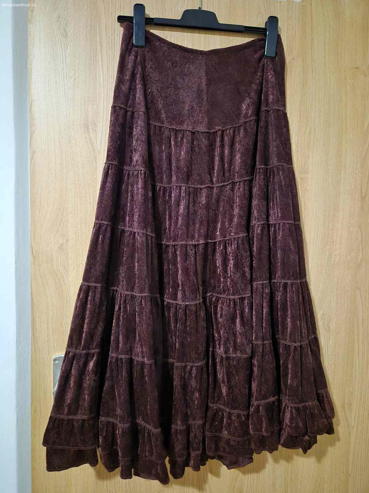 Dámska sukňa, materiál jemný zamat, farba tak do bordó, pas do gumy, dĺžka 85 cm. Použitá 1x.